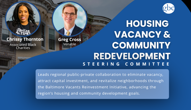 In October 2024, GBC joined Governor Wes Moore and state and local officials for the signing of an executive order to establish Reinvest Baltimore, a coordinated effort between the public sector and civic partners to eliminate 5,000 vacant Baltimore homes in five years, with a commitment of $900 million in state funding. GBC has played a central role in advocating for that support, championing the increase of Project C.O.R.E. funding along with several new state structures and initiatives designed to help high-need communities across the region and the state. GBC’s CEO sits on the Baltimore Vacants Reinvestment Council – created as part of the executive order – and co-chairs the Council’s Finance Committee.